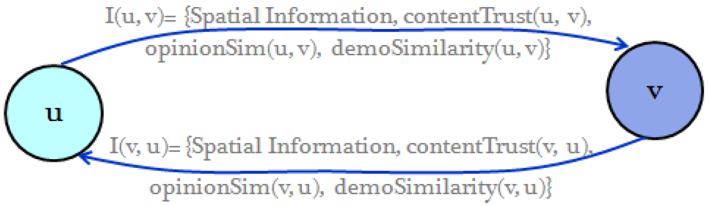 The SNS graph will be either directed or undirected. In an undirected network, edges do not have direction and the relationship from either of the nodes remains the same (symmetric). In reality, the heterogeneous nature of user interactions causes OSNs to be directed networks in nature, and the two neighboring users have different levels of influence (asymmetric) on one another. Figure 2 gives a pictorial representation of the proposed social ties relationship modeling considering two direct neighbor users, and .