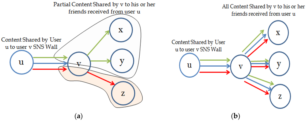 Content sharing by friends and friends-of-friends in an SNS: (a) content sharing by user u to v and v share partial content to his friends; and (b) content sharing by user u to w and w share all content to his friends.