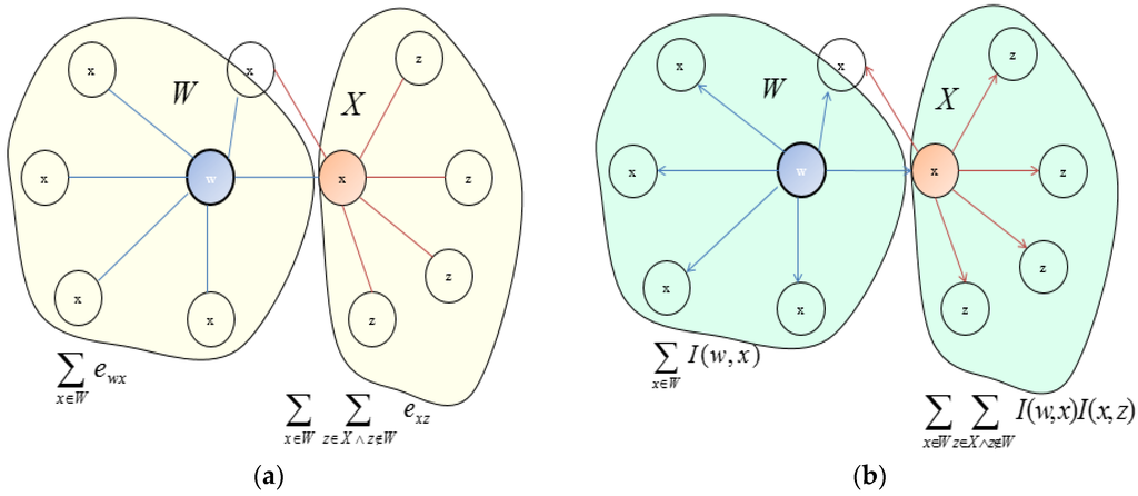 where is a neighbor set of , is one of the neighbors of , and is a neighbor set of . is the edge between two users, which is if present and otherwise. Figure 4 shows the SocNodeRank algorithm, and Figure 4a is the ranking mechanism of an undirected graph (SNS).