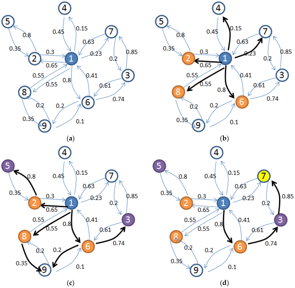 Overview of the proposed temporal aware probabilistic information diffusion process: (a) diffusion process start (t = 1); (b) diffused node at (t = 2); (c) diffusion status at (t = 3); and (d) Information Diffusion at (t = 4).