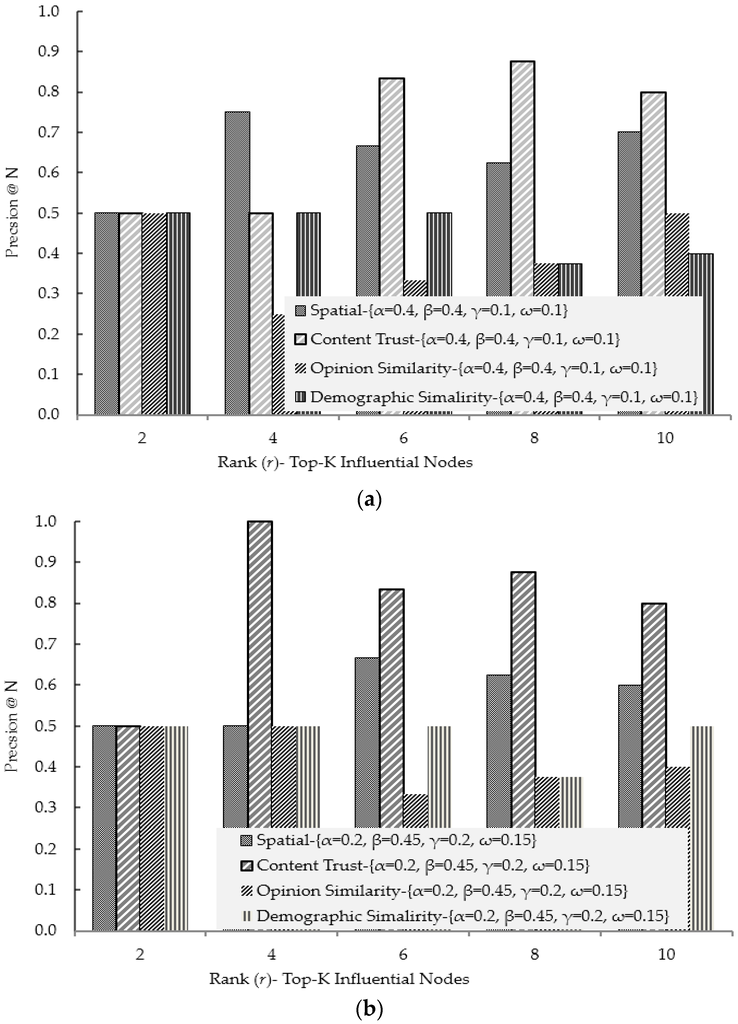 Precision comparison for the selection of multicriteria influence coefficients: (a) precision comparison of the individual attribute based influential node selection with multicriteria consider coefficients ; and (b) precision comparison of the individual attribute based influential node selection with multicriteria consider coefficients .