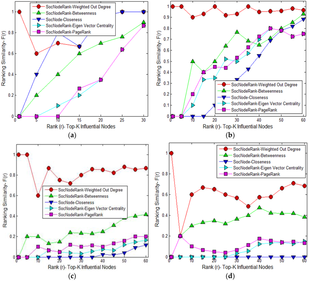 To compare the proposed SocNodeRank with other schemes, the ranking similarity metric from [68] is employed. The ranking similarity F(r) of two schemes at rank can be given by Equation (11).