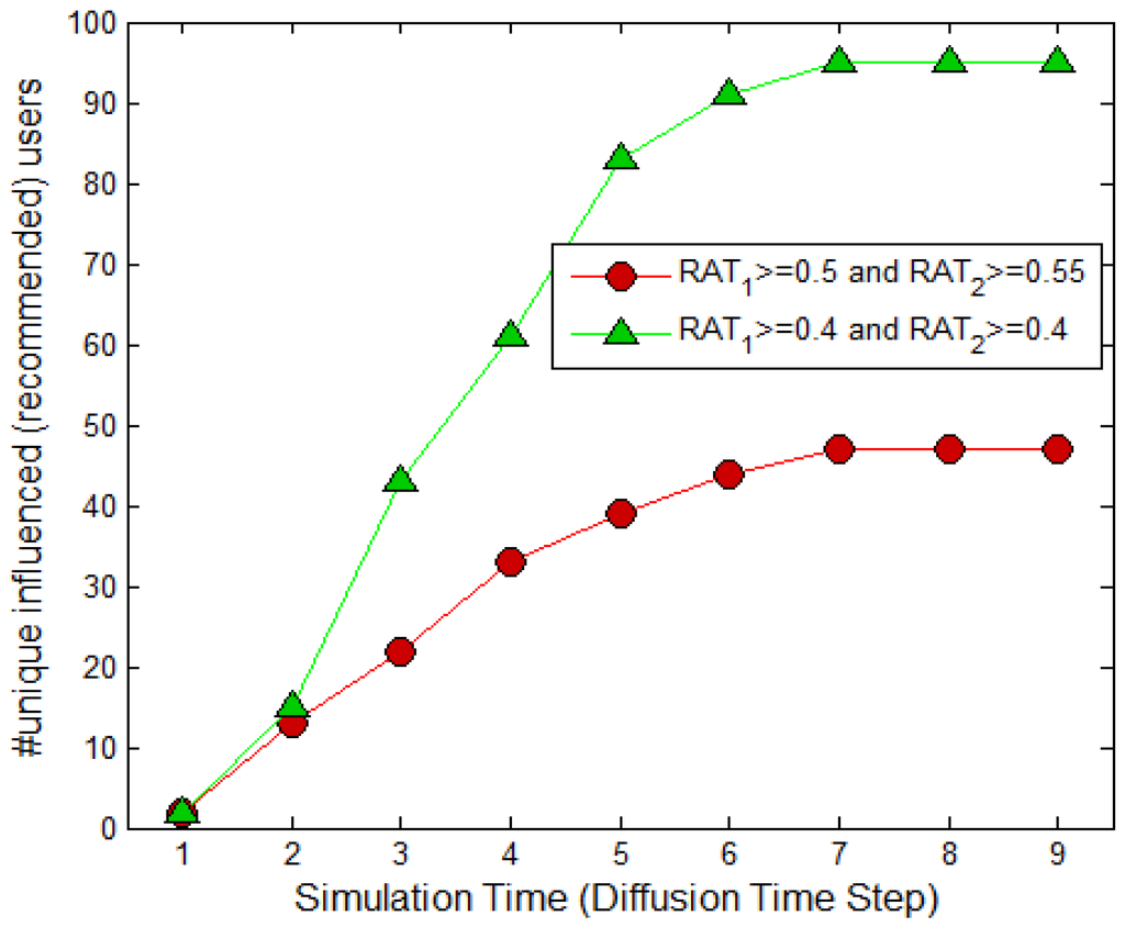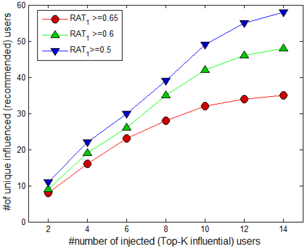 Figure 9 shows the effects of the influential users and the on the number of influenced (recommended) users. The influential users help to diffuse and increase the number of diffused nodes. However, after a certain value of , the influence of the users decreases, and it does not improve the diffusion process.