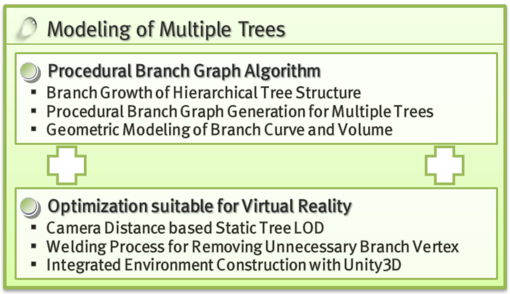 Multiple diverse trees consisting of virtual landscape should be rapidly, effectively and realistically generated for the production of immersive virtual landscape. Moreover, the optimization process of the generated tree models is necessary for a real-time virtual landscape that is appropriate for the virtual reality. This study proposes a procedural branch graph (PBG) algorithm which simultaneously and effectively generates diverse trees with a similar branch pattern in a process of geometrically generating three-dimensional tree models where a single tree grows. Additionally, an optimization method for the tree model with highest complexity in the virtual landscape is proposed to maintain a graphics state required for the virtual reality contents (Figure 1).