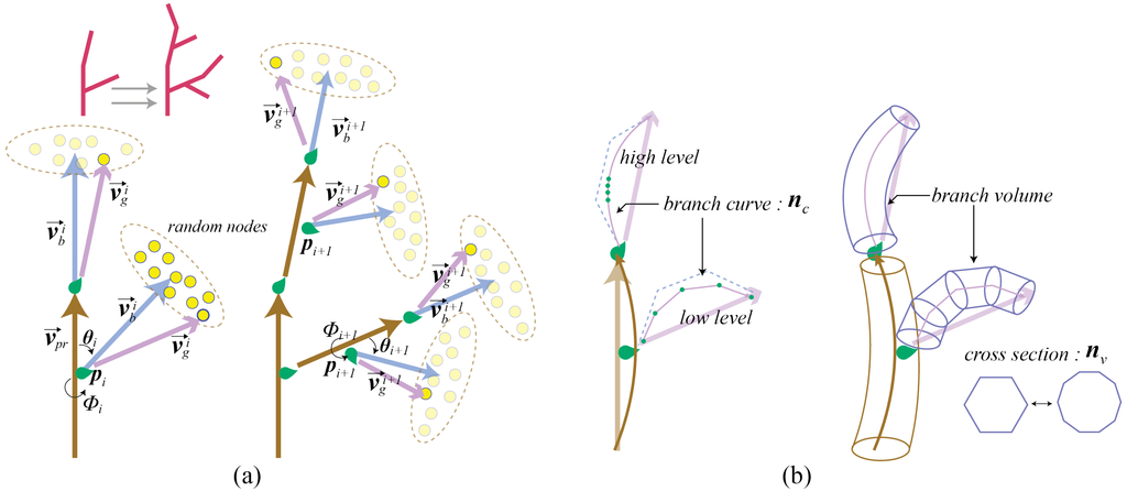 Procedural branch graph(PBG) algorithm process: (a) Branch growth in hierarchy structure for the calculation of branch graph; (b) Geometric modeling that composes branch curve and volume.