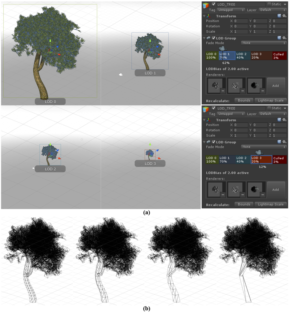 LOD (Level of Detail)-based tree optimization: (a) Process of applying the proposed LOD method to LOD function of Uinty3D; (b) Results of four step tree models generated by the proposed LOD method.