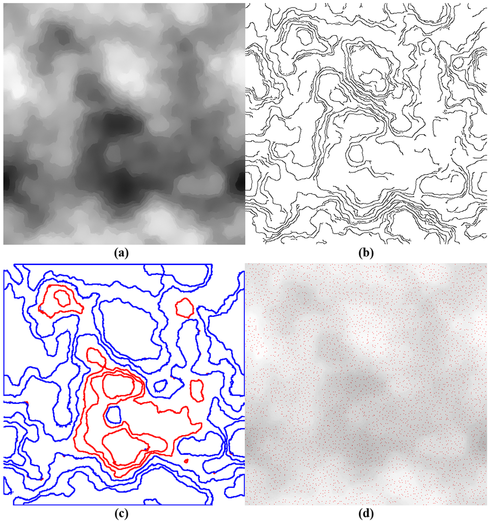 Process of determining the location of tree according to the terrain characteristics through PTT (Pixel To Tree) method: (a) Height map of virtual landscape; (b) Edge detection of terrain map; (c) Area division of terrain based on contour; (d) Determination of the location of tree by using 5 × 5 window pixel.