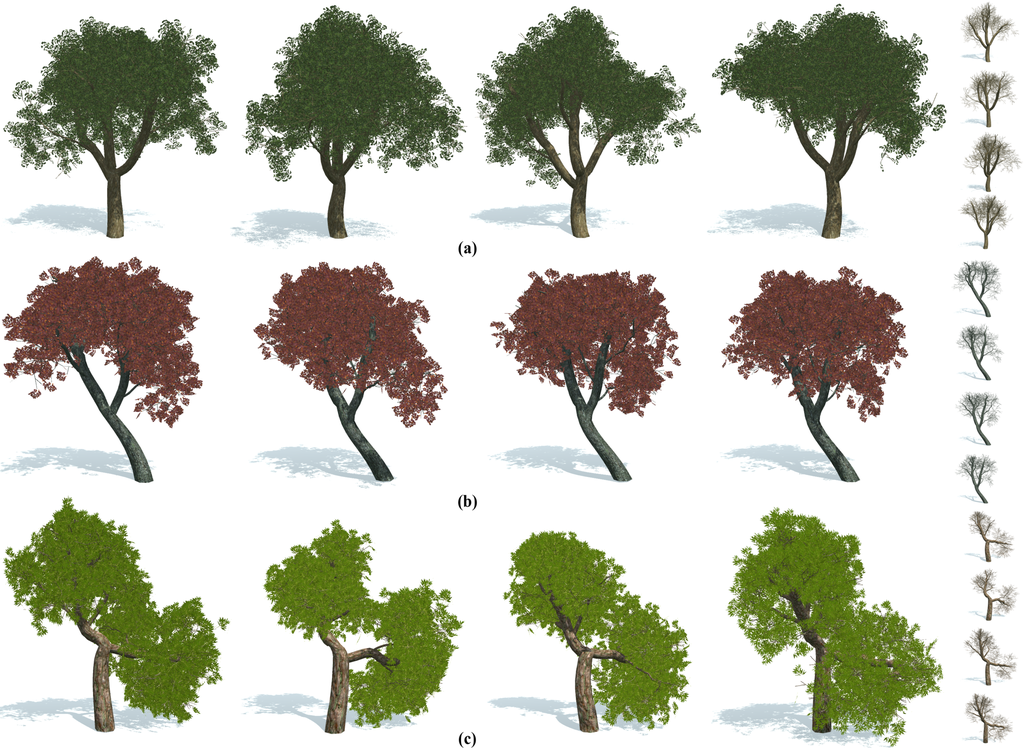 Results of generating multiple diverse tree models through the proposed PBG (Procedural Branch Graph) algorithm (): (a) (); (b) (); (c) ().