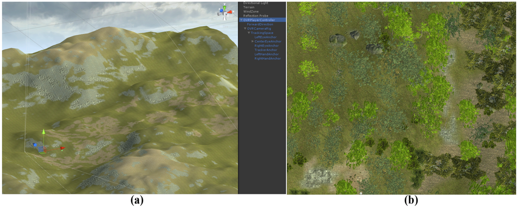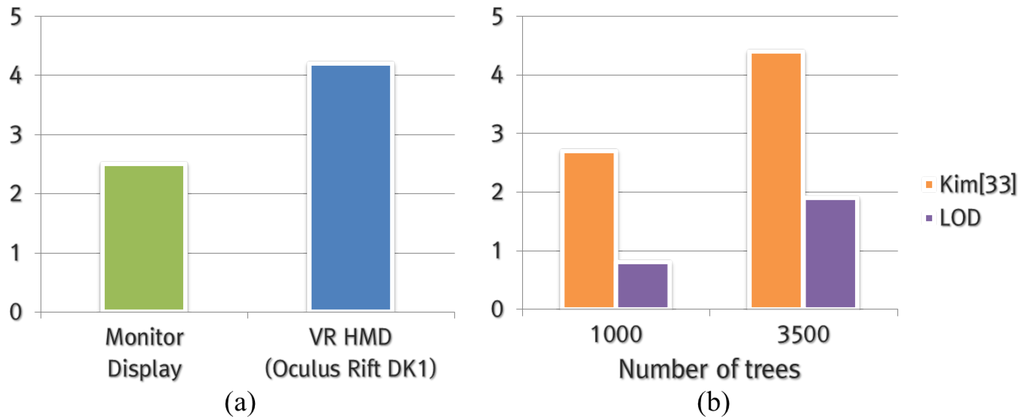 The final step is an experiment in creating contents for immersive virtual landscape based on virtual reality. Immersive virtual landscape was composed through the proposed method and an environment was implemented that users can liberally experience by wearing HMD. As shown in Figure 8, multiple tree models that compose virtual landscape were created through the proposed method and expression of highly immersive virtual landscape was confirmed by additionally allocating diverse forest props. Then, we randomly selected 15 participants to compare created immersive virtual landscapes and respond to a survey comprised of two parts. The first part asked respondents to compare immersion into the natural background of the created virtual landscape presented on an ordinary display monitor with its presentation via a HMD. Figure 9a shows users’ reported sense of immersion, with 5 as the maximum score. These results indicate the immersive virtual landscape presented in the HMD gave users a more realistic experience and fuller sense immersion into nature than did the monitor display. The second part of the survey required respondents to compare the impact of existing studies [33] and LOD optimization on their experience of motion sickness. Figure 9b illustrates perceived motion sickness, with 5 indicating the strongest feeling. Comparing motion sickness existing studies and the application of LOD technique revealed remarkable differences. In particular, the use of LOD with a virtual landscape composed of approximately 1000 trees rarely caused user motion sickness.