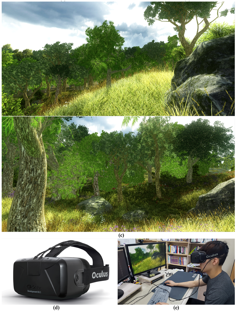 However, graphical factors consisting of the virtual space and methods for their modeling and rendering have been implemented based on the existing computer graphics theory. Here, optimization of scenes such as a limited number of polygons and lighting is important for the immersive virtual reality contents that are transferred through HMD, due to rendering through binocular disparity. If these are not satisfied, delay occurs between head tracking and rendering scene, which becomes a crucial factor that causes users’ motion sickness. Moreover, this also causes occasions that are inappropriate for virtual reality contents. Nevertheless, there is no study aimed at immersive expression of virtual landscape composed of diverse multiple digital plants such as trees and flowers by using virtual reality technique, since it has to consider not only the realistic expression of digital plants, but also the optimization process. In particular, expressing diverse digital trees in virtual reality-based contents is very difficult due to the uniqueness and complexity of the structure in the tree models.