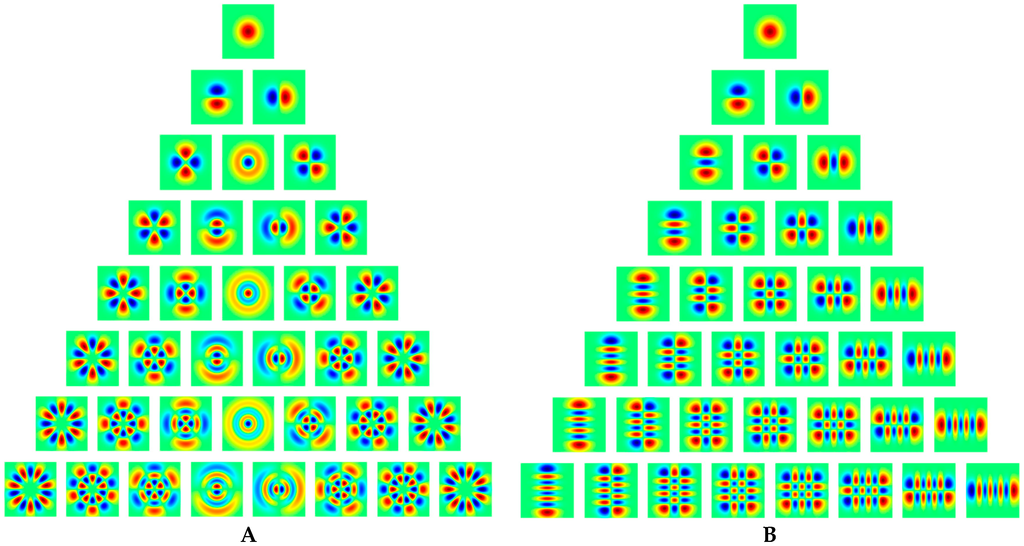 Two-dimensional Hermite (TDH) functions of rank 0–7 in (A) polar form and (B) Cartesian form. The pseudocolor scale (red positive, blue negative) is chosen separately for each function to cover the entire range. Modified with permission from Figure 1 in [], Victor et al., J. Neurophysiol. 95, 375-400. American Physiological Society. 2006.