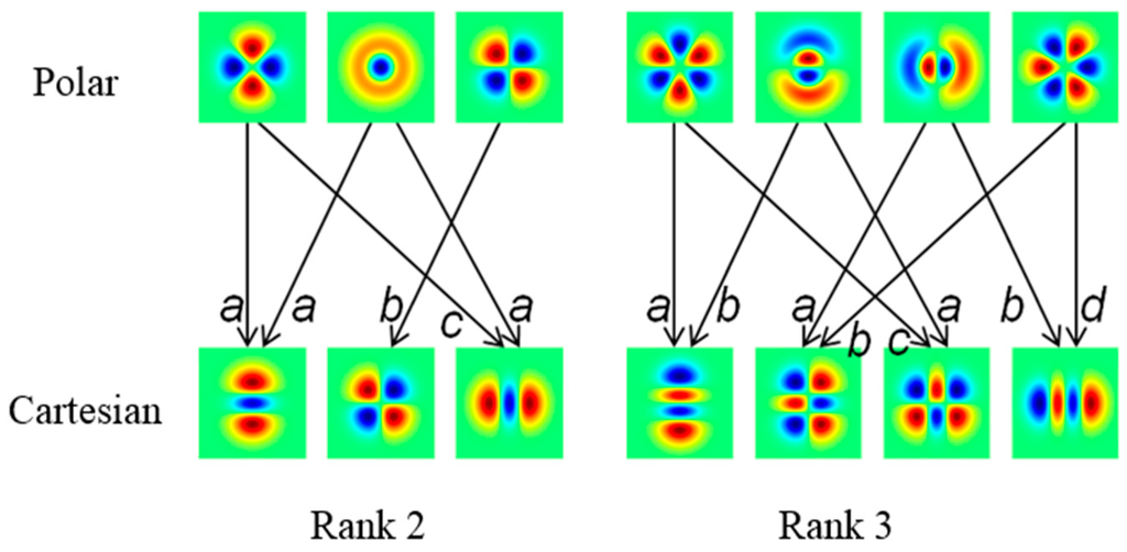 Cartesian TDH functions are a linear combination of polar TDH functions. Examples are shown for rank 2 (left) and rank 3 (right). For rank 2, the coefficients are . For rank 3, the coefficients are  .