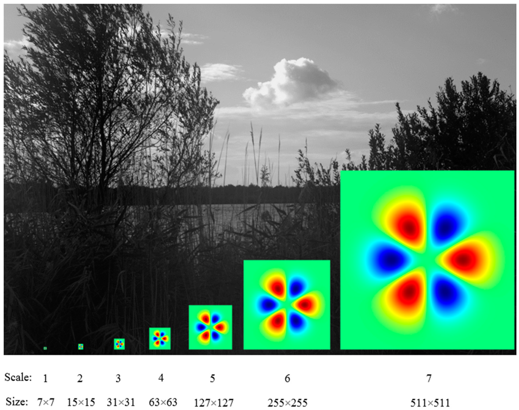 As shown in Figure 3, this calculation was carried out across 7 spatial scales, spaced in approximately octave steps. The smallest scale used was  (0.58) pixels and the largest,  (42.6) pixels. At each scale, the image was convolved with polar TDH functions of ranks 0–7 (36 filters in all), and the convolution was sampled at points placed in a rectangular grid on the filtered image. Filters’ centers were separated by 10 pixels for scales 1–5 and 50 pixels for scales 6 and 7. We then calculated the pure and mixed moments of these distributions up to order 4 and used the extended steerability property (detailed below) to go from the moments for the polar TDH functions to the moments for arbitrary TDH functions. From these moments, skewness and kurtosis were then calculated in the standard fashion.