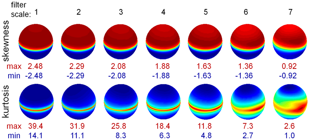 Figure 5 shows the skewness and kurtosis of the distributions for all TDH filters of rank two, plotted on the filter space shown in Figure 4. Skewness and kurtosis depend strongly on latitude, but are largely independent of orientation, although there is a small dependence of kurtosis at the orientation at the two largest scales. Skewness is maximal for the circularly-symmetric (target-like) filters at the poles and is zero for filters on the equator, while kurtosis is minimal for the target-like filters and is maximal for filters on the equator.
