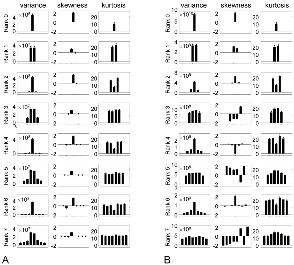 The simple behavior of skewness and kurtosis for the TDH functions is not merely a consequence of their polar symmetry. To see this, we repeated the analysis of Figure 6A, but with the polar TDH functions replaced by binarized variants, in which positive values of the polynomial component (all terms except for the exponentials in Equations (1) and (2)) are replaced by +1 and negative values by −1. The binarized variants have the same polar symmetry and sine/cosine pairing as the original TDH functions and, within ranks, are mutually orthogonal, as well. However, when the polynomial portions of the TDH functions are replaced by ±1, neither skewness nor kurtosis have the same simple behavior seen in Figure 6A. Specifically, while the skewness and kurtosis vary over a wide range (approximately 0–2 for skewness, 10–20 for kurtosis) and this substantial variation is captured in a single basis function at each rank for the original TDH functions, it is spread across many basis functions for the modified ones (Figure 6B).