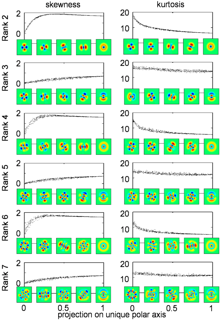 While Figure 6A suggests that the skewness and kurtosis of a general TDH filter depends only on its projection onto the special axis, it only examines filters that are orthogonal to the special axis. For oblique directions, it is possible that this result will not hold. The reason that more complex behavior may arise in oblique directions is that for moments of order three and higher, the steering equations (Equations (9) and (10) in Section 2.4) include contributions from mixed moments of the polar TDHs.