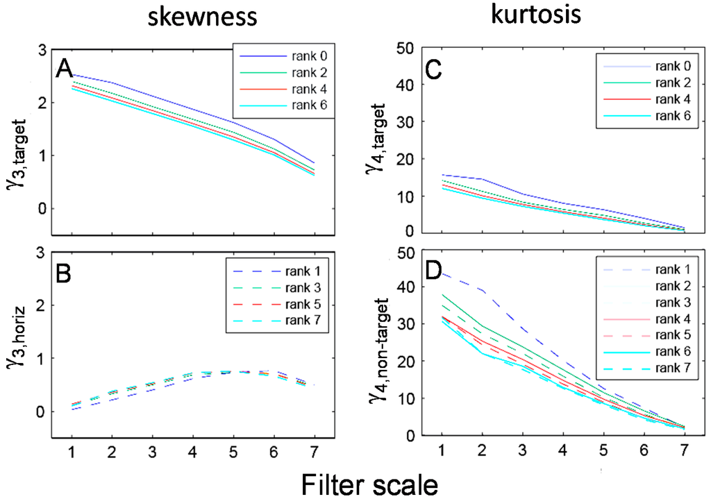Figure 8 uses this finding to describe the distribution of TDH filter coefficients across all spatial scales in a concise manner. Skewness is characterized by its value for the target-like filter at even ranks (; Figure 8A) and for the filter with a single horizontal inversion axis at odd ranks (; Figure 8B).  is a decreasing function of scale and rank, and  is an increasing function of scale and (except for rank one) nearly independent of rank. Kurtosis is characterized by its value for the target-like filter at even ranks (; Figure 8C) and by its value for the remaining filters, at both even and odd ranks (; Figure 8D). Both kurtosis quantities are decreasing functions of scale and rank. It would be of interest to characterize the scaling behaviors of the skewness and kurtosis parameters more precisely, but this is beyond the scope of the present study.