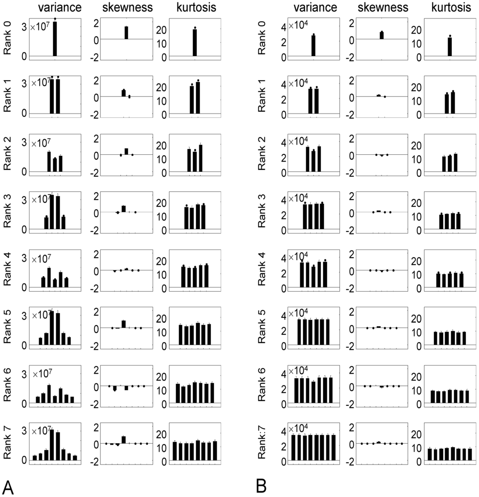 Variance, skewness and kurtosis for (A) natural images filtered by polar TDH filters of rank 0–7 (spatial scale four) and (B) modified TDH filters in which the polynomial component is replaced by its sign. Error bars are three standard errors of measurement (SEM).