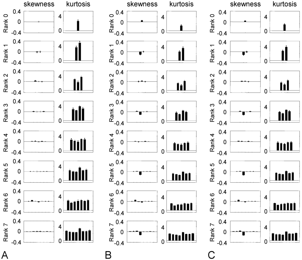 With regard to kurtosis (Figure 6A, third column), the pattern is also a simple one. For even ranks (also consistent with Figure 2), kurtosis is uniform for all filters except the target-like one , shown as the middle bar of each histogram in the right column; for the target-like filter, kurtosis is approximately half the size of the others. For odd ranks, the kurtosis is large, but uniform across all filters. Thus, we find that for each rank, skewness and kurtosis are either uniform across all polar basis functions or uniform for all basis functions, except for one special filter, the odd-rank filter with a single horizontal inversion axis, or the even-rank filter that is target-like.