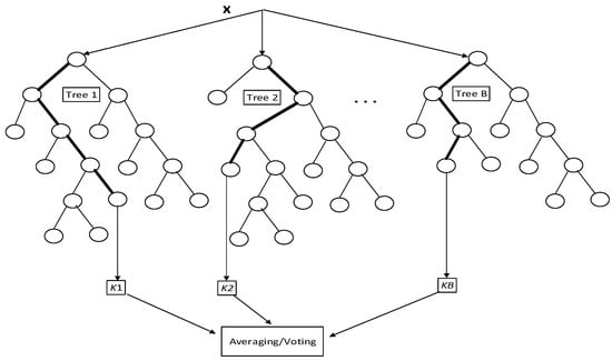 Figure 1 shows that an RF is comprised of a set of B decision trees (tree1, tree2, …, treeB), with each tree having a class label (k1, k2, …, kB) that is used to get a k voted class label. Prediction is made by aggregating the predictions of the weak learners. To classify a new object from an input vector, it passes the sample vector to each of the trees in the forest. Each tree will classify the new object, and the classification results of each tree are combined. The chosen classification for the new object is one that has the most votes over all the classification trees in the forest. As the number of trees grow via RF increase, the test set error rates converge to a limit, meaning that there is no over-fitting in large RFs [10].