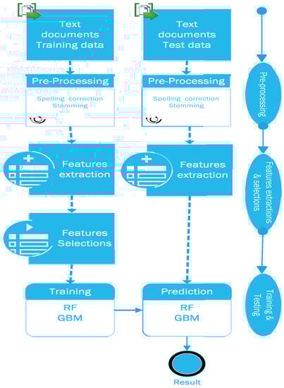 The proposed system is divided into three modules: (1) preprocessing the text data; (2) feature extraction and selection; and (3) training and testing the model. The data flow model with their components is depicted in Figure 2. At one end, text is fed as input to the system, and at the other end, predictive results are generated as output. The raw text with labels becomes the input to the preprocessing module, where spelling correction and stemming occurs. Then, multiple features are extracted from the text, including n-grams, RE, Word2vec, and text statistics of the data. Thereafter, important features are selected by the Boruta algorithm for training purposes. Then, these features are trained on two different training models: RF and GBM. Later, the average output of both models is calculated, which is the final prediction. Furthermore, prediction accuracy is calculated by the kappa’s value. The model is implemented in two different data sets. In the following segments, a closer look is taken at each of the depicted modules, their parts, and the theoretical footing. The proposed model is implemented in two data sets.
