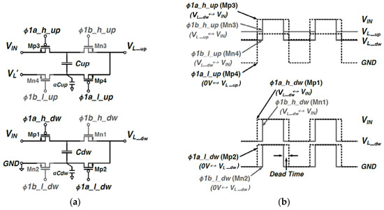 Figure 2a shows the transistor level implementations of the 2-to-1_dw(up) blocks, and Figure 2a shows the gate-driving signals. Since the gate-oxide breakdown voltage of 5 V CMOS transistors in 0.35 μm BCDMOS technology is 5.5 V, all switches can withstand any voltage levels between ground (0 V) and input (5 V). All the gate driving signals in Figure 2b are generated from the level shifters and the non-overlapping clock generators to minimize the switching loss and shoot-through current loss, which will be shown in Figure 5 in Section 3. The NMOS transistors (Mn1, Mn3, and Mn4) in Figure 2a are implemented by means of a triple-well device to isolate the body voltage from the substrate (or bulk).