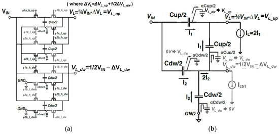 The 2-way interleaved structure of the proposed SC DC–DC converter shown in Figure 3a is used for simplicity of the analysis. For the gate driving signals, ϕ1a (ϕ1b) and ϕ2a (ϕ2b) are 180° out of phase signals, while ϕ1a (ϕ2b) and ϕ1b (ϕ2b) represent non-overlapping clock signals, which are shown in Figure 2b. Figure 3b represents the equivalent circuit during every half period (phase1 and phase2) of the switching frequency. Assuming that the SC DC–DC converter delivers charge to the loads at average voltages of VL_up (or VL) and VL_dw, the charge extracted from the input voltage source (QEXT(VIN)) during every half period of the switching frequency (when the MOS transistors which have the gate-driving signals of ϕ1a (ϕ1b) and ϕ2b (ϕ2a) are on) can be derived as: