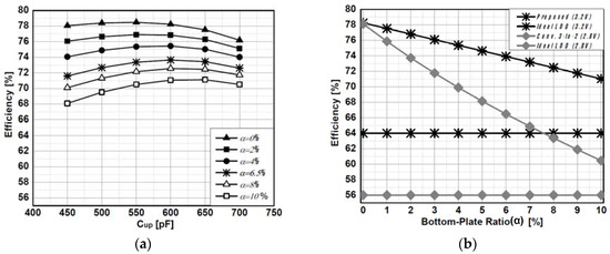Assuming the bottom-plate capacitance ratio (α) is 0%, Equation (9) can be used to verify the previous analysis.To determine the optimum ratio between Cup and Cdw with non-zero, Cup is swept from 450 pF to 700 pF at a different bottom-plate capacitance ratio (α). Cup is altered from 0% to 10% while the total flying capacitance Cfly is maintained at 900 pF. As shown in Figure 4a, the maximum efficiency of 78.5% is obtained when Cup is 550 pF and α is 0%. According to Equation (9), the maximum load is supposed to be obtained when Cup is twice the value of Cdw; that is, Cup = 600 pF. The discrepancy can be explained from the neglected control current (Ictrl) in Equation (5). However, as α increases from 0% to 10%, the maximum efficiency points in Figure 4a moves to the right hand side of the x-axis while the overall efficiency decreases linearly, which can be explained with Equation (10). However, as shown in Figure 3b, since the voltage swing (VL_up − VL_dw) at the top bottom-plate capacitors (Cup/2) is always smaller than the voltage swing (VL_dw) at the bottom bottom-plate capacitors (Cdw/2) for the range of Cup between 450 pF and 700 pF, the energy loss due to the bottom-plate capacitor is reduced as Cup increases. As the maximum efficiency of 73.5% is obtained when Cup is 600 pF and is 6.5% from Figure 4a, Cup and Cdw are selected to be 600 pF and 300 pF, respectively, for the implementation.