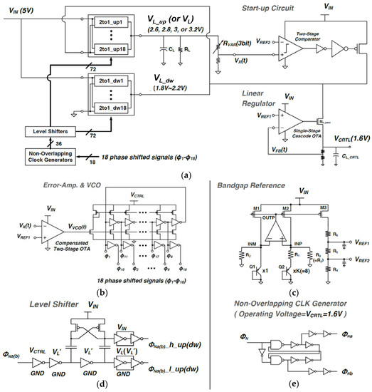 As shown in Figure 5, the start-up circuit and load regulation circuits (error-amplifier and linear regulator) of the proposed architecture are based on two reference voltages (VREF1 and VREF2) from a modified single bandgap voltage reference, which is based on Reference [7]. Once the internal load voltage (VL_dw) is charged up to about 1.8 V by start-up circuit, the power supply voltage of the control circuits (VCTRL) is regulated at 1.6 V by NMOS pass transistor-based low-drop out (LDO) voltage regulator connected to the internal load voltage (VL_dw), which is the output voltage of the 2-to-1_dw. Therefore, the reduction of control loss is achieved by decreasing the dynamic power consumption in the current-starved VCO and 18 non-overlapping clock generators. In addition, the internal load voltage (VL_dw) is used to generate low swing level-shifted gate-driving signals to reduce switching loss.