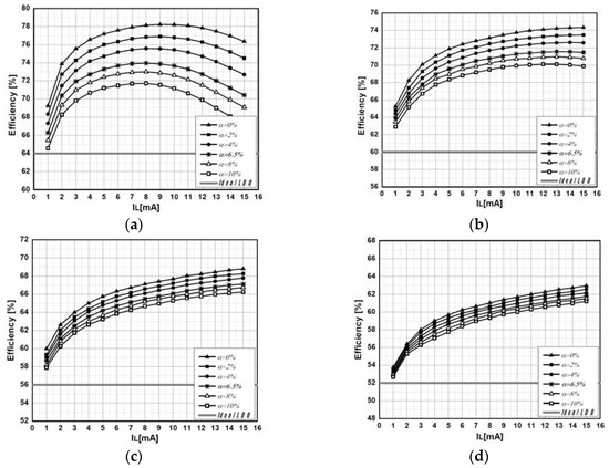 The proposed on-chip SC DC–DC converter is designed and simulated using high-voltage 0.35 μm BCDMOS technology. Figure 6 shows the efficiency comparison between the proposed on-chip SC DC–DC converter and the ideal linear regulator when they deliver a different load current (IL) between 1 mA and 15 mA at four different output load voltage levels (VL or VL_up, henceforth referred to as VL). The efficiency is also shown for a different bottom-plate capacitance ratio (α) between 0% and 10%. In order to effectively visualize the degrees of the efficiency drop, which increase when the proposed converter is set to support one of four different output load voltage levels (3.2 V, 3 V, 2.8 V, and 2.6 V), the scale of the y-axis is adjusted to show the maximum efficiency change of 20%.