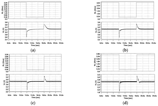 Figure 7 shows the transient responses at four different load voltage levels when the load current (IL) changes from 1 mA to 10 mA, and vice versa. The worst-case transient response occurs with the load current transition from 10 mA to 1 mA when the load voltage is regulated at 3.2 V; the recovery time is about 2 μs, while the average response time of the load current variation between 10 mA (1 mA) and 1 mA (10 mA) is less than 1.5 μs. The worst-case peak-to-peak output ripple voltage occurs when the proposed SC DC–DC converter delivers a 1 mA load current to a 2.6 V load voltage as shown in Figure 7d; it is about 150 mV and 5.77% of the load voltage (VL = 2.6 V) when the output buffer capacitor of 400 pF is added to the load.