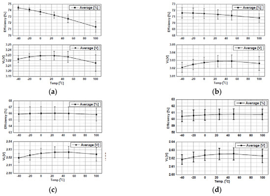 Average and 1-sigma variation of the load voltage (VL) [V] and the efficiency [%] with process–voltage–temperature (PVT) variations. (a) VL = 3.2 V, IL = 10 mA. (b) VL = 3 V, IL = 10 mA. (c) VL = 2.8 V, IL = 10 mA. (d) VL = 2.6 V, IL = 10 mA.