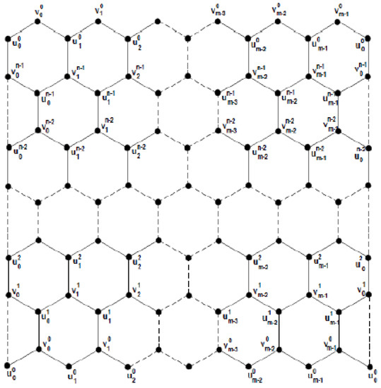 Hence We can easily observe from Figure 12 that the number of vertices in are 2mn and the number of edges in are 3mn. Note that there is only one type of edge in a toroidal polyhex, based on degrees of end vertices of each edge. The edge partition contains 3mn edges uv, where