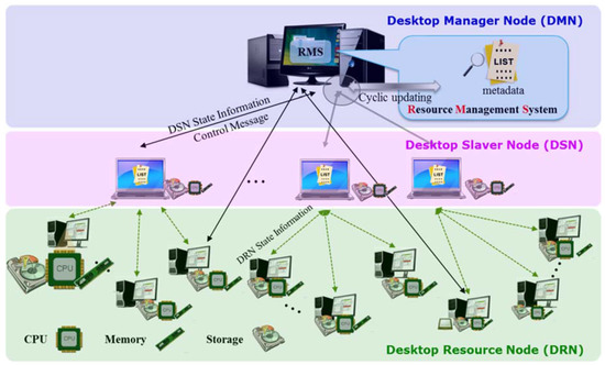 DIaaS requires the stratification of distributed resource integration for job requests, identification, allocation, and performance for desktop-based computing, and storage services. As shown in Figure 1, the distributed integrated resource management scheme consists of desktop resource nodes (DRNs), which are metadata-based, on-premise resources, desktop slave nodes (DSNs), which manage DRNs, and desktop manager nodes (DMNs), which control DSNs. Here, metadata means the minimum unit of the resource information for on-premise resources. It refers to resource specifications, settings, and status information.