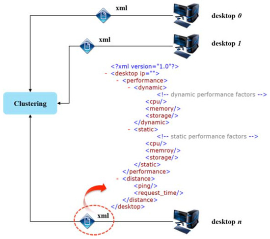 The computing service of DIaaS provides appropriate job allocation through on-premise-based clustering. For the on-premise-based integrated resource clustering elements, mark-up languages (XMLs) are defined, as shown in Figure 4. They are defined based on performance and distance information, such as the CPU, memory, and storage of the desktop metadata shown in Figure 3a. For the basic clustering elements, distance and performance are used. If accomplishing a time measurement by pinging is impossible on account of the network settings, the request time of the operating desktop is used. For performance, the dynamic performance factors, including the idle CPU performance, main memory, and remaining storage size, as well as the static performance factors—including the basic CPU performance, memory, and storage size of the resource—are used.