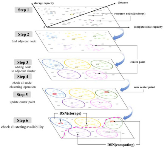 For stored data amount, the resource of the smallest size is selected as the DMN substitute after normalization of all the connected resources. It is based on the resource with the minimum size of total stored data. The response time, based on the periodic heartbeat, is applied to the substitute server settings, with the reference distance set as the normalized value based on the shortest response time. After the initial DIaaS resource clustering process, the DSN role settings achieved through the Steps in Figure 5 are required for allocating the computing and storage services.