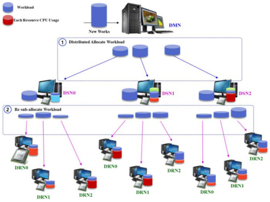 In this paper, resources were allocated in a hierarchical manner based on the updated CPU information for each computing service request, as shown in Figure 6. In ① of Figure 6, a new divided computing service is allocated in proportion to the CPU speed of the current DSN according to Equation (4). The DSN is allocated by subdividing the divided computing service in the DRN to which it belongs.
