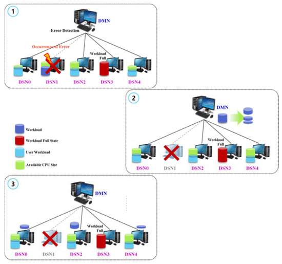 In ① of the figure, a fault situation for DSN1 of the DMN is shown. The DMN divides the computing service as shown in ②, except for DSN3, to which no service can be assigned. Moreover, it considers the resource conditions of DSN0, DSN2, DSN3, and DSN4. Finally, continued service is performed by re-allocating resources to DSN0, DSN2, and DSN4, as shown in ③ of Figure 7.