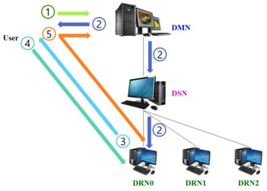 In ① of Figure 8, the storage requester solicits the storage service of the DMN. In ②, the DMN sends the metadata of the DSN that can provide the storage service to the storage requester. It simultaneously sends to the DSN the metadata for the IP address and port number to be connected with the storage requester. The storage requester awaits a “ready” message from the DRN to implement a connection trial to the DRN for data storage.
