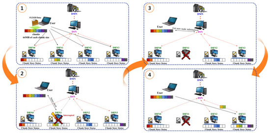 The storage services of DIaaS are divided into storing data and requesting stored data. In the case of storing data, the data to be stored is divided into 64 MB chunks, as shown in the HDFS [20,21] and GFS [20,21]. Furthermore, the chunk size can be changed by a user setting in DIaaS. Figure 8 shows the process of allocating storage resources to the DSN, which plays the storage service role in the DIaaS.