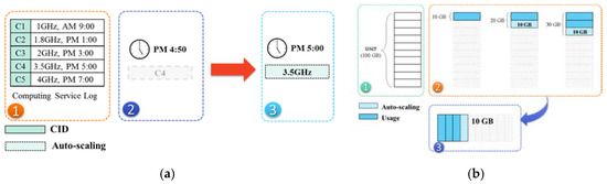 First, the computing service auto-scheme defines the automatic expansion method according to a computing log. It is automatically expanded, as shown in Figure 10a. Accordingly, idle computing resources are held in the time slot in which the same computing service is requested. In ① of Figure 10a, the requested time for the computing service and the specific requested computing service are shown as a computing service log.