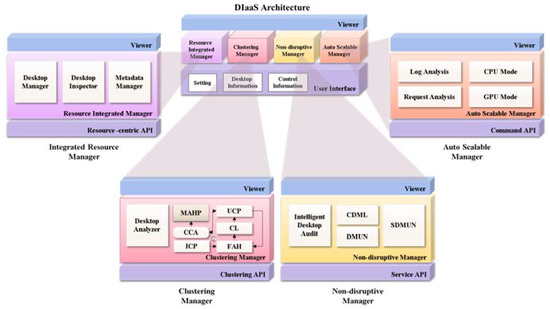The DIaaS is composed of a user interface for user controls, including the on-premise resource setting, desktop information, and control information; The resource-integrated manager for distributed on-premise resource integration; Clustering manager for hierarchical resource management; Nondisruptive manager for continuous computing and storage support services; Auto-scalable manager for minimization of resource waste in the intra-cloud; and viewer for visualization of the on-premise resource management operations (Figure 11).