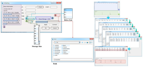 In ① of Figure 12a, the basic information of the resource attempting to connect to the DMN is shown. It includes the IP address, host name, and storage drive setting. Here, T denotes the total storage size, U represents the usage storage size, and F is the free storage size. In ② of the same figure, the storage drive allocated to the DMN is set. In ③, the storage allocated for the DMN is set. In ④, visualization information is provided for the drive set by the user and the storage size. In ⑤, the path for sharing the storage in the DMN is set through the activated path dialogue.