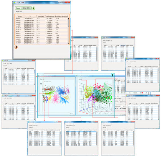 In this paper, the actual clustering was verified through the development of a simulator. Figure 13 shows 1000 random desktops, the settings of 10 clusters, and the clustered resource information, which are the results of the simulation. In ① of Figure 13, the information from the resources selected by the user for a DSN cluster is presented. In ②, cluster information is provided to the user for IP-based identification when a cluster DSN is selected. In ③, the information of the DRN, a desktop included in the DSN, is provided.