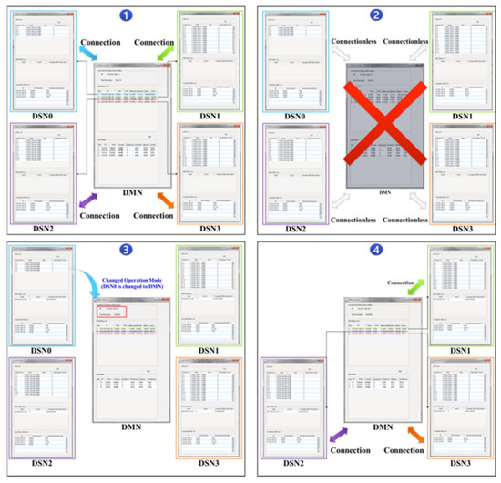 For the nondisruptive service following a DMN error, the DMN and the four DSNs beneath it are connected, as shown in Figure 14. When a DMN error occurs, the first DSN in the candidate DMN list is replaced with the DMN. In ① of Figure 14, a case in which the DMN normally operates is shown. In ② of the same figure, the connections from DSN0, DSN1, DSN2, and DSN3 to the DMN are released as a result of a DMN error. In ③, the substitute server candidate of the first priority is determined based on the metadata from the candidate DMN list. In ④, the DSNs, excluding the DSN selected as the DMN, are connected to the new DMN. After the connection, the new candidate DMN list is sent to every DSN through the new DMN for synchronization.