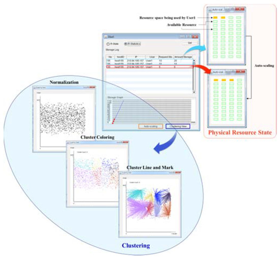 The auto-scalable scheme is implemented by the log, and requests computing and storage services. The basic operation process is shown in Figure 15. The required resources are automatically expanded according to the resource requested by the desktop. When 30 GB of storage are provided, 10 GB are used during the initial stage, and 10 GB are provided during the next stage through automatic expansion.