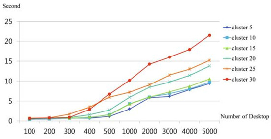 For the performance evaluation, the DIaaS created an artificial server error environment for testing the clustering delay time and nondisruptive service for computing and storage services. First, to measure the clustering delay time, the number of desktops was increased to 100, 200, 300, 400, 500, 1000, 2000, 3000, 4000, and 5000, as shown in Figure 16. Clustering was performed after the number of clusters was increased to 5, 10, 15, 20, 25, and 30 at each increasing point. The clustering speed at each increasing point was determined by averaging the performance speeds obtained from 50 cycles. The definition of cycle is the average value of execution number for each clustering. It required more than 10 s to accomplish this task for 1000 desktops, and 21 s when clustering was performed using 30 clusters and 5000 desktops. As shown in Figure 15, this process was more efficient and cost effective than the clustering test using 5000 actual desktops and the related cost of labor, electricity, and time.