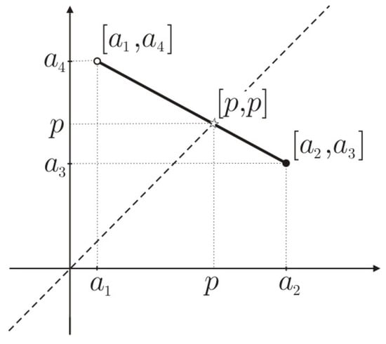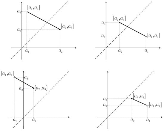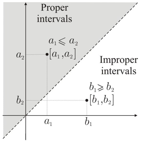 In the set of modal intervals, we distinguish proper intervals as those modal intervals whose modality is ∃; and improper intervals as those whose modality is ∀. Thus, A is proper if and A is improper if . We identify proper intervals as the classical intervals. We will denote the proper interval by , and the improper interval by . Using this notation, the interval is the proper interval and the interval is the improper interval . A pointwise interval can be considered as either proper or improper. Moore’s semiplane is useful to represent classical intervals, but it is not detailed enough to represent modal intervals, whose graphic representation must be in the interval plane (see Figure 1).