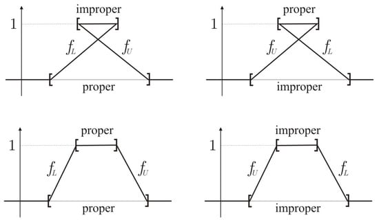It is possible to consider the membership function of an MITFN, but it is difficult to represent improper intervals in the Cartesian plane. However, a graphical visualization of the functions and is provided in Figure 2.