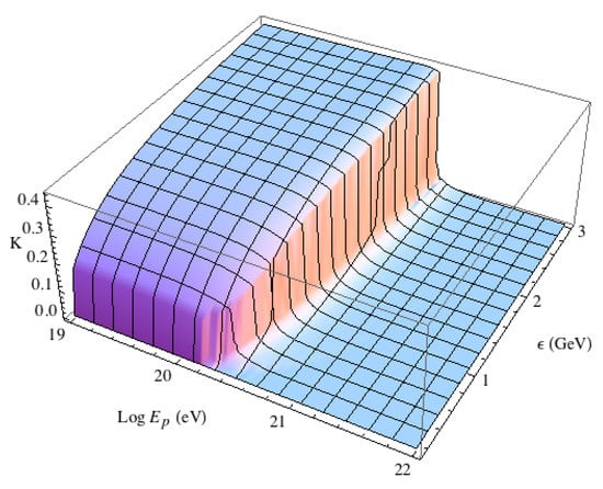 The calculated proton inelasticity modified by LIV for as a function of CBR photon energy and proton energy [].